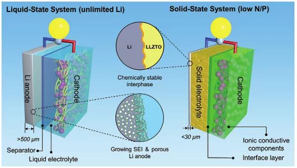 圖1 使用液體電解質和固體電解質的鋰金屬電池的比較。