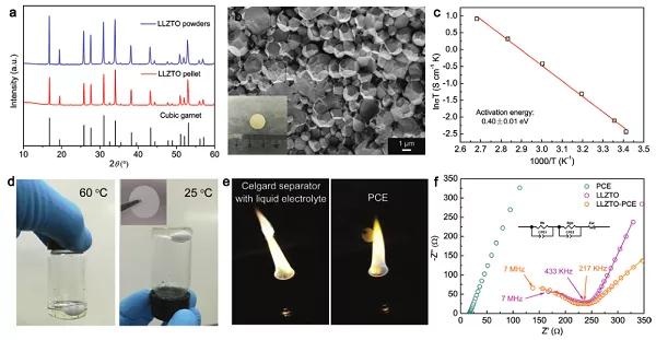 圖2 固態電解質表征。(a)XRD;(b)截面SEM圖;(c)LLZTO薄片的Arrhenius圖;(d)PCE在60℃(左)和25℃(右)時的照片;(e)火焰測試的光學圖像;(f)EIS譜。
