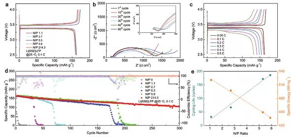 圖4 采用Au–LLZTO–PCE固體電解質和有限量的金屬鋰負極的全固態電池的電化學性能。(a)充放電曲線;(b)EIS圖;(c)倍率性能;(d)循環性能;(e)循環壽命、比能量和N/P比的關系。