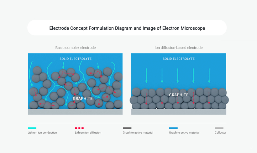 在常規(guī)全固態(tài)二次電池的電極結(jié)構(gòu)中,固體電解質(zhì)負(fù)責(zé)傳導(dǎo)離子,導(dǎo)電添加劑提供電子傳導(dǎo)方式,活性材料負(fù)責(zé)儲(chǔ)存能量,而粘合劑可以從物理和化學(xué)意義上支持這些構(gòu)成部分。然而,ETRI的研究人員通過系統(tǒng)性實(shí)驗(yàn)發(fā)現(xiàn),即使在石墨活性物質(zhì)顆粒之間,也可以傳輸離子。他們提出一種新的電極結(jié)構(gòu),可用于僅由活性物質(zhì)和粘合劑組成的全固態(tài)二次電池。研究人員證實(shí),即使電極內(nèi)沒有固體電解質(zhì)添加劑,全固態(tài)二次電池也可以表現(xiàn)出更好的性能。