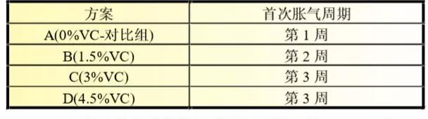 表1 不同VC含量電解液電池首次脹氣對應的周期