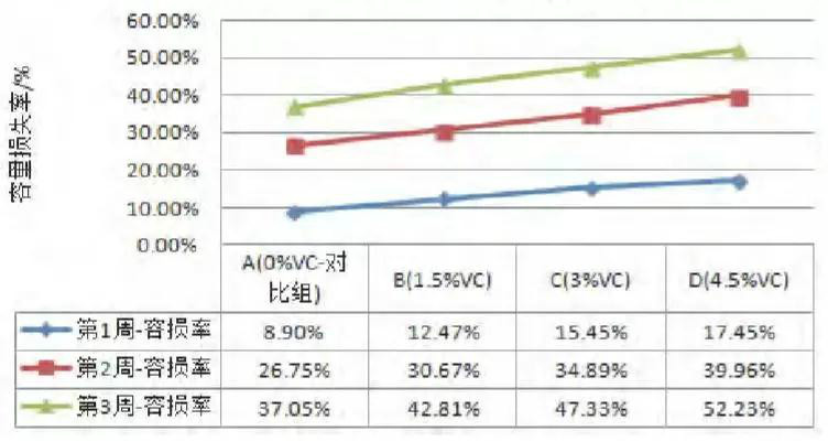 實驗步驟:將1.2節中的A~D四個方案電池,①測試初始容量、厚度;②充滿電;③置于85 ℃恒溫箱中48h;④取出冷卻至室溫后,復測容量、厚度;從②~④不斷重復,直至全部脹氣截止測試;對比四個方案出現首次脹氣的周期、容量損失率、膨脹率。由表1可知,方案C和D抗高溫脹氣能力強,均在第3周遭受 85 ℃ 48 h 時才出現脹氣;由圖1可知,方案C和D在每周高溫沖擊后,其電芯膨脹率相比方案A和B小很多;由圖2可知,電解液中添加VC的電池容量損失程度比不添加VC的要大,且隨著VC添加量的增加,容量損失也增加。