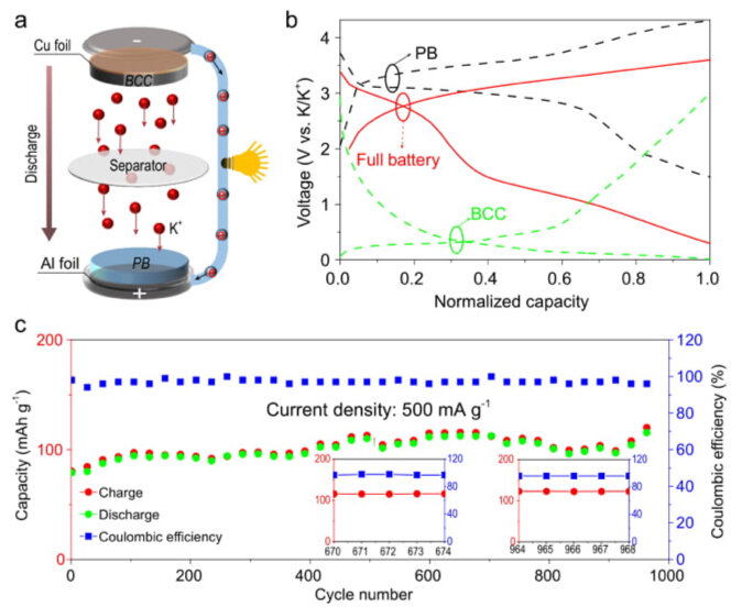 碳納米管負責連接碳電池的內部和外部,提供大量的離子通道,大量的離子通道增加了離子的擴散路徑,提高了傳輸速率。而BCCs內部空間為鉀離子插入石墨引起的體積變化提供了緩沖,胞狀膜的碳殼對內部材料和整體結構起到保護和支撐作用,極大地提高了PIB的循環穩定性。