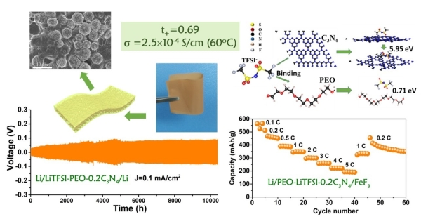 圖1.碳氮微球堆垛增強(qiáng)的聚合物電解質(zhì)及其構(gòu)造的轉(zhuǎn)換型鋰/氟化鐵全固態(tài)電池