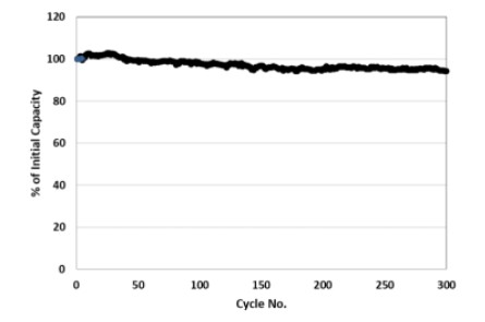 圖 1:使用Electrovaya專有固態混合電池技術的多個樣品的容量保持率。紐扣電芯樣品在室溫和100% DOD下以C/5速率循環,循環300次后的容量保持率約為94%。