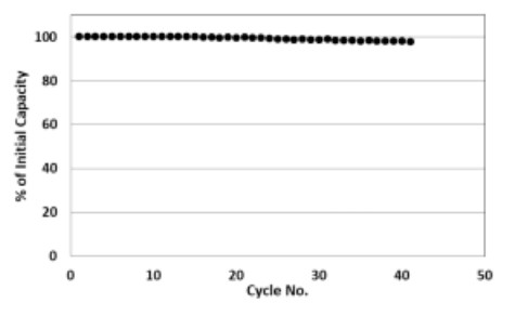 圖 2:使用Electrovaya專有固態混合電池技術的軟包電芯的容量保持率。樣品在室溫和100% DOD下以C/5速率循環,未對電芯施加外部壓力。