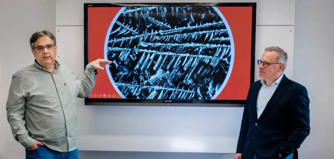 Theion 首席技術(shù)官 Marek Slavik(左)和首席執(zhí)行官 Dr. Ulrich Ehmes 介紹水晶電池的硫晶體