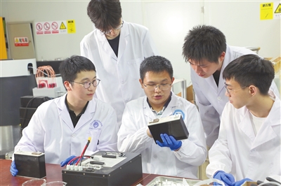 “我們研發的固態電池能量密度高達450瓦時每千克,快速充電30分鐘即可,續航里程可達800公里以上。”王子豪是團隊項目負責人,談及項目,這名控制工程專業的在讀研究生自信滿滿。走進團隊的實驗室,整齊排放的藍色電芯被整體封裝在規整的電池盒中,身著實驗服的團隊成員正對研究成果——全固態硅碳鉭鋰氧化物綠色動力電池進行測試、調試。