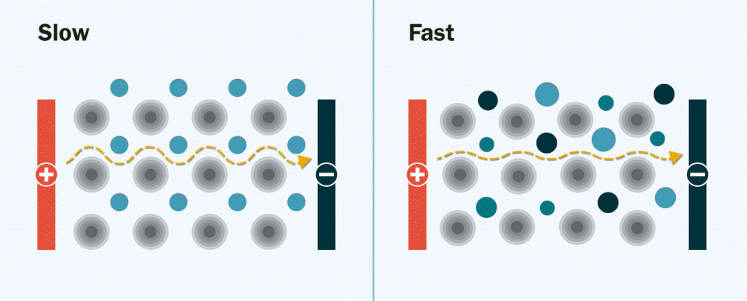 研究人員認為,在傳統的固態電解質中一般字包含一種金屬(藍色球表示),鋰離子(黃色球表示)在有序的固態電解質中移動緩慢和受限制。從而阻礙了離子傳導性和電池性能。而在混合了多種金屬后(藍色,藍綠色和海軍藍色球),制造了新的路徑,如同在擁擠的高速公路上增加高速公路一樣——鋰離子可以通過它快速穿過電解質。