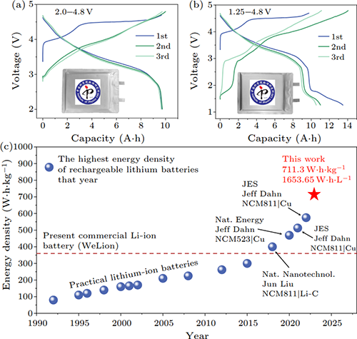 最近,中國科學院物理研究所/北京凝聚態物理國家研究中心HE01組李泉博士、博士研究生楊旸在李泓研究員和禹習謙研究員的指導下,研制了一種基于高容量富鋰錳基氧化物正極和超薄金屬鋰負極的具有超高質量能量密度和體積能量密度的10Ah級軟包鋰二次電池,經中國北方車輛研究所(201所)北方汽車質量監督檢驗鑒定試驗所的第三方測試,首次放電質量能量密度達到711.30 Wh/kg、體積能量密度達到1653.65 Wh/L。研究人員通過拓寬富鋰錳基氧化物的充放電電位獲得更高材料儲鋰容量、采用隔膜涂層技術解決超薄鋰大面容量沉積可逆性、并探索厚電極、貧電解液、超薄集流體的匹配性應用等綜合策略,最終實現了超高能量密度電池的可逆充放電。該數據為目前已公開報道的鋰二次電池的能量密度最高值。