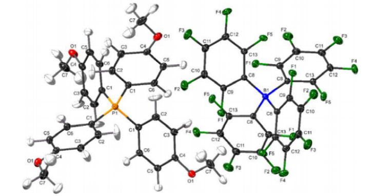 研究人員提出了一種新型氟化WCC-WCA鹽,即:四對(duì)甲氧基苯基膦四(五氟苯基)硼酸鹽或TAPOMe/TFAB,單晶X射線晶體結(jié)構(gòu)(圖1)。