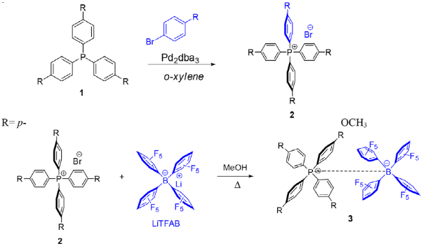 新型TAPR/TFAB(R = p-OCH3)鹽的合成分兩步進(jìn)行。從合成的角度來(lái)看,作者設(shè)想在一個(gè)摩爾當(dāng)量的TAP 和商業(yè)的LiTFAB發(fā)生復(fù)分解反應(yīng),將生成TAPR/TFAB(R = p-OCH3),隨后通過(guò)在芳酰鹵化物和取代的三芳基磷化氫之間用鈀催化的交叉偶聯(lián)反應(yīng)合成;ⅰ