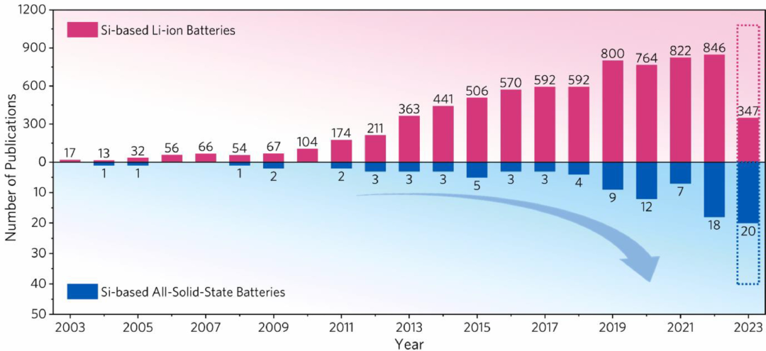 【圖2】應用于能源相關領域的硅基鋰離子電池和硅基全固態電池的出版趨勢,展示硅基負極材料的進展。