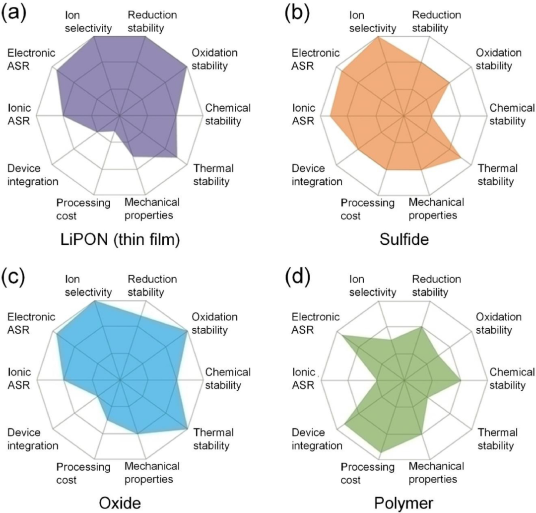 值得注意的是,硅基電池中的ASSE也需要高的整體性能,如下所述。例如,厚度應該小于20微米;電化學穩定性窗口應該高于5 V以與高壓陰極兼容;室溫下離子電導率應高于10-4S cm-1;以及高離子選擇性(鋰離子的遷移數)、高化學穩定性、熱穩定性、堅固的機械性能、低加工成本、容易的設備集成和低電子面積比電阻(圖4)。不幸的是,很難找到一個理想的ASSE,可以滿足上述所有性能要求,甚至在長時間循環中保持這些特性。迄今為止,LiPON型、硫化物型、氧化物型和聚合物型陽極已被證實與硅基陽極相容。