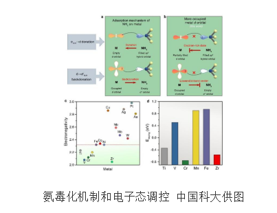 研究人員發現,將鉻摻雜入鉬鎳合金,不僅獲得鎳的富電子態來抑制氨σ軌道向鎳d軌道的電子供給,同時還使d帶中心下移阻隔了鎳d軌道向氨σ*反鍵軌道的反向電子供給,兩者協同作用大大削弱了氨吸附。