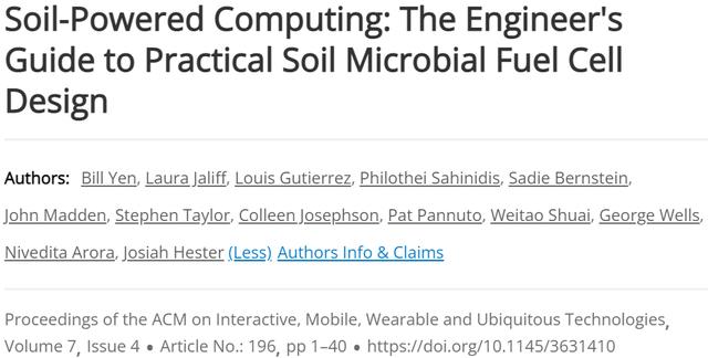 近日,相關(guān)論文以《土壤驅(qū)動計(jì)算:工程師的實(shí)用土壤微生物燃料電池設(shè)計(jì)指南》(Soil-Powered Computing: The Engineer's Guide to Practical Soil Microbial Fuel Cell Design)為題發(fā)表在 Proceedings of the ACM on Interactive, Mobile, Wearable and Ubiquitous Technologies[1]。