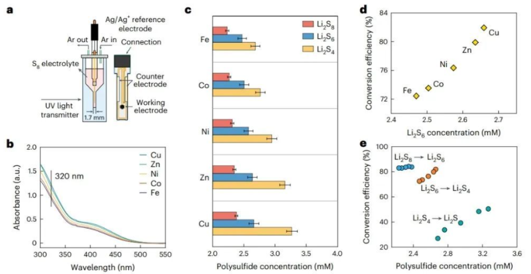 以 Fe、Co、Ni、Cu、Zn 等一系列碳基過渡金屬催化劑為例,他們發(fā)現(xiàn)硫還原反應的動力學,與多硫化鋰在催化劑表面的濃度相關,即動力學會隨著多硫化鋰濃度的增加而提升。