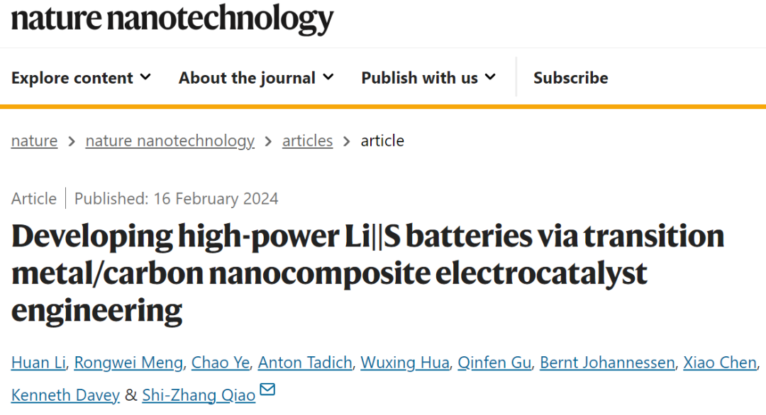最終,相關論文以《通過過渡金屬/碳納米復合電催化劑工程開發(fā)大功率電池》(Developing high-power Li||S batteries via transition metal/carbon nanocomposite electrocatalyst engineering)為題發(fā)在 Nature Nanotechnology(IF 38.3)。