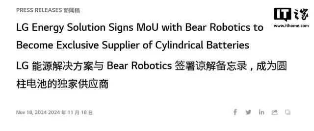 LG 新能源(LG Energy Solution)今天宣布,與硅谷公司 Bear Robotics 簽署了一份諒解備忘錄(MoU),成為其圓柱形電池單元的獨家供應商。兩家公司還將在技術創新方面展開合作。