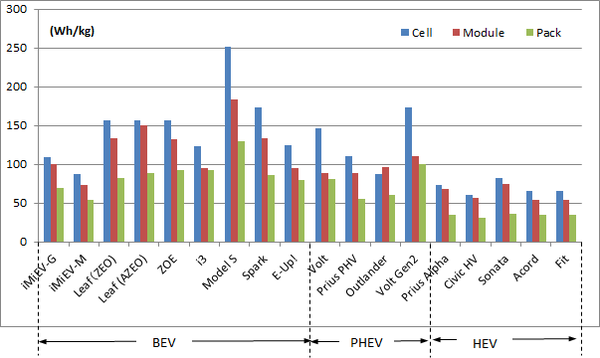 在介紹特斯拉BMS之前,我們先了解它所采用的松下三元材料18650型號(鎳鈷鋁酸鋰)電池。作為動力輸出的后盾,電池對電動汽車的作用不言而喻。由于本身性能較穩定、安全系數較高且可循環充電次數多,磷酸鐵鋰電池是目前市場上動力電池的首選,如雪佛蘭Volt、日產Leaf、比亞迪E6等等。與現在電動車電池的主流趨勢不同,特斯拉是唯一直接采用18650型鋰離子電池的廠商,與磷酸鐵鋰電池相比,這種電池雖然技術較為成熟,功率高、能量密度大、且一致性較高(也就解釋了下圖Model S電池能量密度遠超其他車型),但同樣這種電池安全系數較低,熱特性和電特性較差,成本也相對較高。