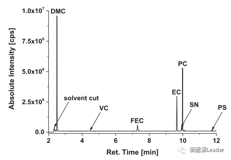 下圖是從全新電池中提取的電解液的氣相色譜儀分析結果,從其中能夠看到電解液常見的溶劑和添加劑的。