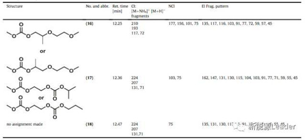在10-13min的范圍內,在新電池提取的電解液中檢測到了PS和甲氧基-EC(11號峰),甲氧基-EC是在化成過程中VC與甲醇鋰LiOMe反應的產物,由于VC對LiOMe的捕獲效應,VC能夠抑制在化成和循環過程中碳酸烷酯的形成(例如12號峰對應的DMDOHC和15號峰對應的EMDOHC)。在45℃循環的電池能夠檢測到11號峰和12號峰對應的產物,還有一種無法確定結構的分解產物。而20℃循環的電池,除了檢測到11號和12號峰對應的產物外,還檢測到了另外6種分解產物,下圖是13號峰所對應的分解產物的形成機理,15號峰所對應的產物為EMDOHC,可能是EC與LiOMe或者EMC和DMC的反應產物。對16號峰進行詳細分析發現,分解產物的結構中含有兩個甲氧基側鏈,但是更詳盡的結構信息暫時還無法獲取。17號峰分析發現,該峰對應的產物含有甲醇鹽和丙醇鹽側鏈,而18號峰對應的產物則含有兩個甲醇鹽的側鏈。