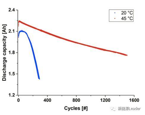 電池在20℃和45℃下的循環性能曲線如下圖所示,從結果上來看,溫度對電池的循環性能有著顯著的影響,在45℃下循環的電池具有更好的循環性能,壽命終止時循環次數在1500次左右,而20℃下電池的循環性能很差,僅僅循環300次左右就已經達到了壽命終止,分析認為,導致20℃下電池的循環性能差的原因主要是因為PC溶劑的共嵌入和石墨片層剝落。