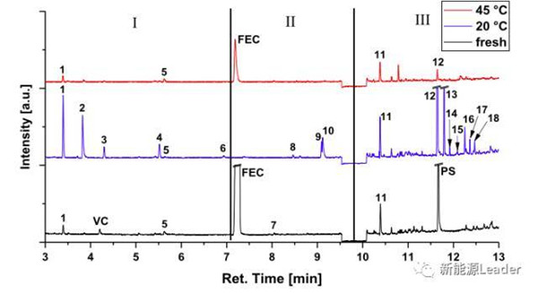 下圖是從新電池、20℃和45℃循環電池內獲取的電解液的氣相色譜分析結果,為了便于分析Xaver Monnighoff將分析結果分為三個部分,分別是3-7min,7-10min和10-13min。在區域1中,新電池的電解液檢測到了三個峰值,分別對應的是EMC和單氟磷酸鹽EMFP(可能是電池在化成和SEI成膜過程中由于VC分解產生),以及VC。在45℃循環電池的電解液中只發現了EMC和EMFP,這說明在成膜過程中已經將VC完全消耗。而在20℃循環的電池中發現了多種分解產物,從圖片上能夠看到EMC(1號峰),DMFP(2號峰)和EMFP(5號峰),以及其他三種含有丙烯鏈的產物(3,4和6號峰),分別為甲基異丙基碳酸酯(3號峰MiPrC),碳酸甲丙酯(4號峰MPrC), 1,2-二乙氧基丙烷(6號峰),沒有檢測到VC。