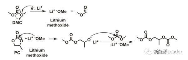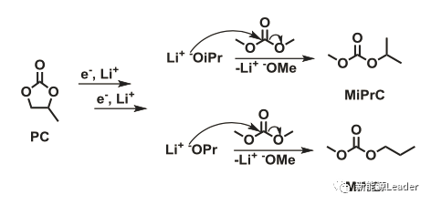 這其中1,2和5號峰所對應的產物的形成機理都已經有過報道,而3,4和6號峰所對應的產物還暫時沒有報道,經過分析Xaver Monnighoff認為3,4號產物的產生機理如下式所示。6號峰所對應的產物的形成機理可能是PC溶劑的開環反應,