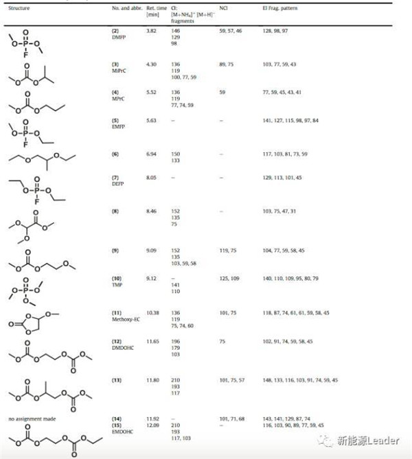 在7-10min鐘的范圍內,在新電池的電解液中檢測到了FEC和氟磷酸二乙酯DEFP(7號峰),在45℃循環的電池能夠檢測到FEC,但是20℃循環的電池沒有檢測到FEC,表明所有的FEC都已經被消耗了,并且檢測到了另外幾種分解產物,其中8號峰對應的為2,2-二甲氧基乙酸甲酯,9號峰為2-甲氧基乙基甲基碳酸酯,10號峰為TMP,這在之前的文章中也都有報道。