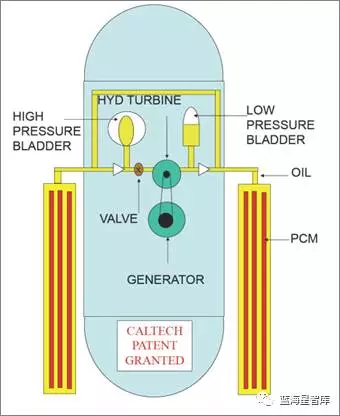 SOLO-TREC無人潛航器利用不同溫度下的相變材料為蓄電池充電。相變材料加熱至10℃以上時,會膨脹約13%,冷卻到10℃以下時,也會相應收縮。因此在海平面時體積膨脹,在深海時體積縮小。相變材料與油囊結合使用,膨脹/收縮過程中產生的高壓油可收集起來,定時釋放,從而驅動液壓馬達發電,每次潛水可給電池充電約1.6 Wh。
