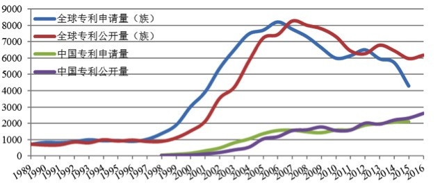 圖中揭示的是國際和國內(nèi)專利的年度分布情況。考慮到專利一般從申請到公開需要長達(dá)1年甚至3年的時(shí)間,因此專利年度申請數(shù)量在2015年(包括)以后出現(xiàn)失真。2015-2016年專利分布情況可以參考年度專利公開數(shù)量。