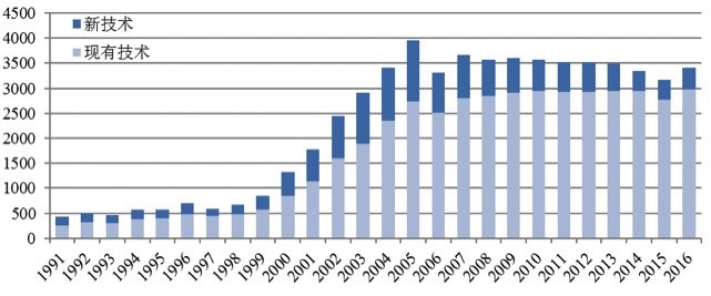 圖中將IPC分類號(hào)數(shù)量近似算作技術(shù)的數(shù)量,深藍(lán)色表示當(dāng)年新出現(xiàn)的技術(shù),淺藍(lán)色表示當(dāng)年之前已經(jīng)存在的技術(shù)。圖中顯示,燃料電池技術(shù)在1999年前后,新技術(shù)和已有技術(shù)同步快速增長,發(fā)展到2006年,隨著年度技術(shù)數(shù)量基本保持平穩(wěn),新技術(shù)的比例呈現(xiàn)下降趨勢,反映出行業(yè)技術(shù)趨于成熟。