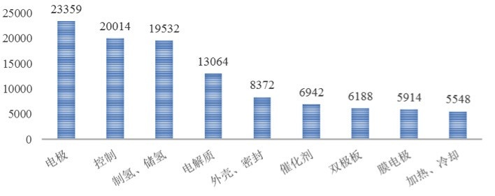 2. 國內(nèi)技術(shù)研發(fā)重點(diǎn)指向電極、制氫、儲(chǔ)氫、電解質(zhì)膜、控制、催化劑等技術(shù)