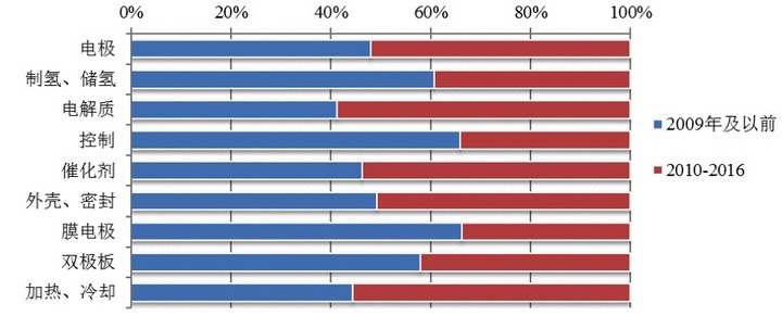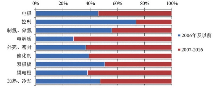 圖中可以看出,電解質(zhì)、外殼和密封、催化劑、膜電極組件等技術(shù)在最近幾年的發(fā)展速度超過平均發(fā)展速度。顯示這些技術(shù)為近期燃料電池領(lǐng)域技術(shù)研發(fā)熱點(diǎn),得到研發(fā)機(jī)構(gòu)的追捧。