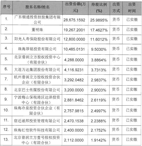 截至目前,根據珠海市工商局公開信息顯示,截至今年3月31日,珠海銀隆共有24家股東。其中,廣東銀通投資控股集團有限公司持股為25.98%,為第一大股東;董明珠個人出資金額已達1.927億元,持股比例上升為17.46%,超過陽光人壽成為第二大股東。