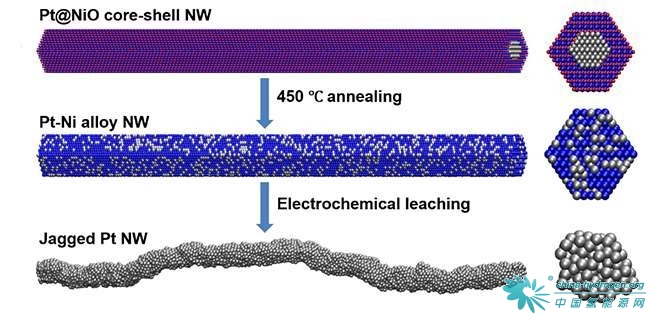 加利福尼亞大學洛杉磯分校的研究人員發現,可以通過熱退火過程將溶液通過納米線合成技術轉化成鉑-鎳合金納米線。團隊接著通過電化學合金化或浸出將納米線轉變成鋸齒狀的鉑納米線。
