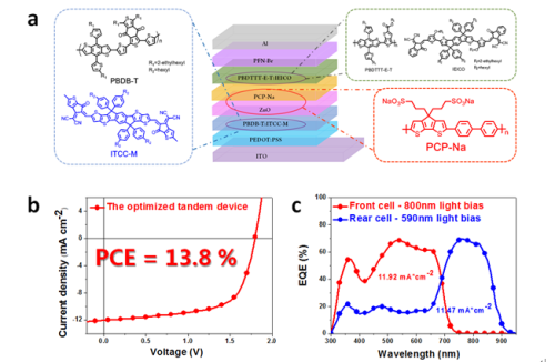 研究人員借助團隊在聚合物-非富勒烯型有機光伏電池中的積累,分別優化了非富勒烯型寬、窄帶隙材料和電池制備方法,在寬帶隙電池中實現了超過1V的開路電壓(Adv. Mater. 2017, 29, 1700254),在窄帶隙電池中實現了超過20 mA/cm2的短路電流密度(Adv. Mater. 2016, 28, 8283)。基于此,團隊進一步發展了用于制備疊層電池子電池之間連接層的中性導電高分子電極修飾材料(Adv. Mater. 2016, 28, 434;Macromolecules 2016, 49, 8126),成功構建了高效率疊層器件。當疊層電池中兩個子電池之一為富勒烯受體時,疊層電池的光電轉換效率超過了文獻報道的最高值,達到12.8%(Adv. Mater. 2017, 29, 1606340)當均采用非富勒烯型光伏活性層子電池時,電池效率實現進一步突破,達到了13.8%(J. Am. Chem. Soc. 2017, 139, 7302)。該結果大幅超過了已見報道的最高結果,創造了新的疊層有機光伏電池的世界記錄。