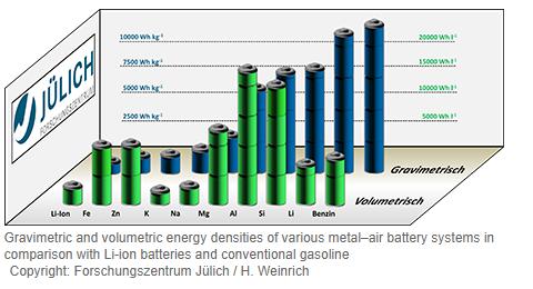 鋰-空氣電池的最大能量密度將達到11400 Wh/kg,但其技術難度極大、復雜性較高。然而,如果按體積能量密度來比對,鐵-空氣電池的表現則更好:9700 Wh/l,幾乎是當前鋰離子電池(2000 Wh/l)體積能量密度的5倍,鋰-空氣電池的體積能量密度“僅為”6000 Wh/l。對于眾多移動設備而言,鐵-空氣電池的吸引力依然很大,因為體積(空間)要求也成為了移動應用的一項重要參數指標。