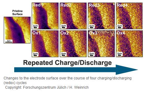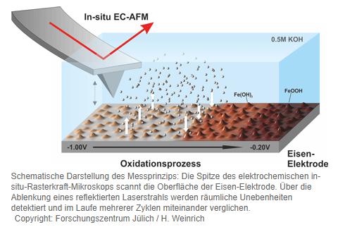 于利希研究中心采用了美國橡樹嶺國家實驗室納米材料科學中心(Center for Nanophase Materials Sciences)的原位電化學原子力顯微鏡(in situ electrochemical atomic force microscopes)對鐵-空氣電池的充放電情況進行觀察,并確認氧化鐵顆粒(Fe(OH)2)是如何形成于鐵電極之上的。