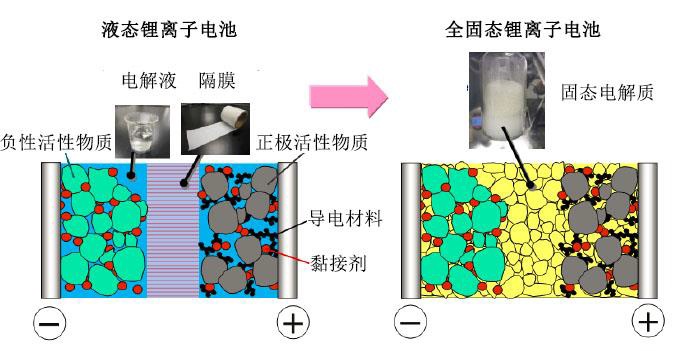 圖1 傳統液態鋰離子電池與全固態鋰離子電池示意圖