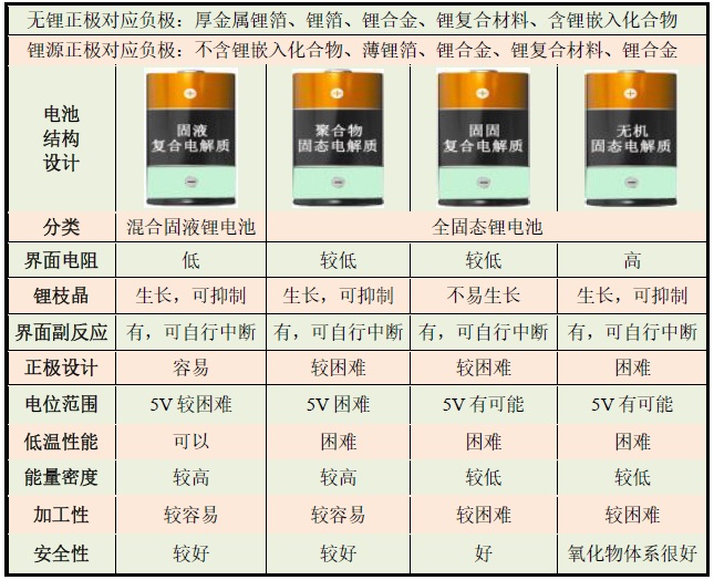 表1 不同電解質類型的混合固液鋰電池和全固態鋰二次電池類型及特點