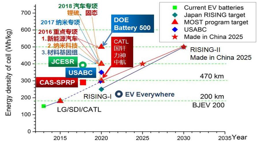 為應對新能源汽車越來越急迫的高性能需求,各國都已經開始布局高能量密度鋰電池, 如日本政府提出,2020年動力電池電芯能量密度將達到250 W·h/kg,2030年達到500 W·h/kg;美國先進電池聯合會(USABC)提出將2020年電芯能量密度由原來的220 W·h/kg提高至350 W·h/kg;中國國務院發布的《中國制造2025》中明確提出,2020年中國動力電池單體比能量達到300 W·h/kg,2025年達到400 W·h/kg,2030年達到500 W·h/kg。美國Battery500項目提出,2020年研制出能量密度達到500 W·h/kg的動力電池樣品。提高電芯能量密度,必然要求兼顧安全性,因此發展全固態鋰二次電池技術,具有重要的意義。