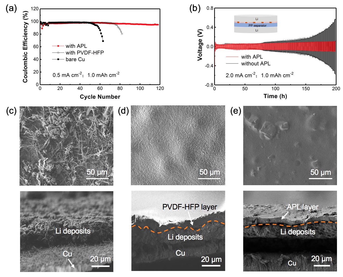 為了構建穩定的金屬鋰/電解液界面,調控鋰的均勻沉積,該課題組提出以無機LiF為剛性組分,以PVDF-HFP聚合物為柔性組分來構建“剛柔相濟”的復合膜,以在電化學循環過程中穩定金屬鋰與電解液的界面。其中,柔性聚合物提供的柔性和可伸縮性可承受金屬鋰電極沉積/溶解過程中的界面波動,而剛性組分的引入可進一步提升修飾層的機械模量,從而抑制鋰枝晶生長,實現鋰的均勻沉積。將這種同時具有好的形變性能、高的機械模量和離子導率的界面修飾層引入到紐扣電池中后,Li-Cu半電池、Li-Li對稱電池的循環壽命以及循環穩定性都顯著提升;與磷酸鐵鋰正極匹配的全電池測試中,復合層修飾后的電池循環壽命提升了2.5倍。
