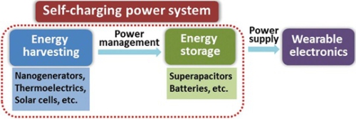 近年來,便攜式可穿戴式電子設備被大規模應用,并朝著小型化、智能化、多功能化和柔性化發展。然而,可穿戴電子產品面臨的主要問題是現有的電池不足以為其持續供電,頻繁的充電和更換電池限制其進一步發展。為解決這一問題,除了提高儲能電池的能量密度以外,另一可行的解決方案是將能量轉換和存儲裝置集成為自充電能源系統(Self-charging Power Systems, SCPS),這使收集的能量可以實時存儲,并實現可持續的電力供應,這一方案近日在學術界引起廣泛關注和深入研究。研究人員已成功研制出多種能量收集器件,包括摩擦納米發電機(TENG)、壓電納米發電機(PENG)、太陽能電池和熱電發電機等,這些能量收集設備可與儲能設備(電池、超級電容器)結合,進一步被集成在柔性、可穿戴電子設備中,實時補償電子設備的能量消耗,甚至實現能量的自給自足。