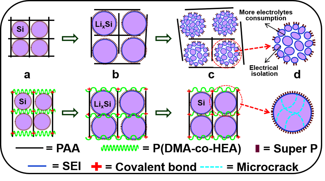 近日,上海交通大學化學化工學院楊軍教授研究團隊在Cell Press旗下的能源領域新刊Joule發表了題為“Silicon Microparticle Anodes with Self-Healing Multiple Network Binder”的文章,文中所設計的多級網絡結構并帶有自愈合功能的水系粘結劑(PAA-P(HEA-co-DMA))可以有效緩解微米硅電極在充放電過程中由于活性物質的體積變化引起的顆粒粉化和電子導電缺失現象,進而獲得性能優異的硅基負極。