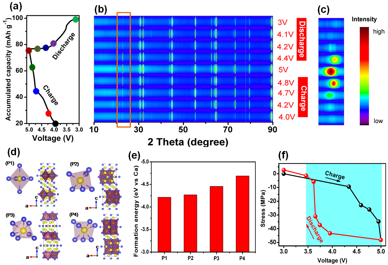 圖1.(a)錫金屬負極在鈣離子電解液中的首次充放電曲線;(b,c)XRD分析表明,在充電過程中鈣離子和錫負極發生合金化反應生成Ca7Sn6合金,在放電時Ca7Sn6發生去合金化反應;(d,e)鈣離子和錫在Ca7Sn6合金相中的四種成鍵情形及其對應的結合能;(f)錫負極首次充放電過程的原位電化學應力測試曲線。