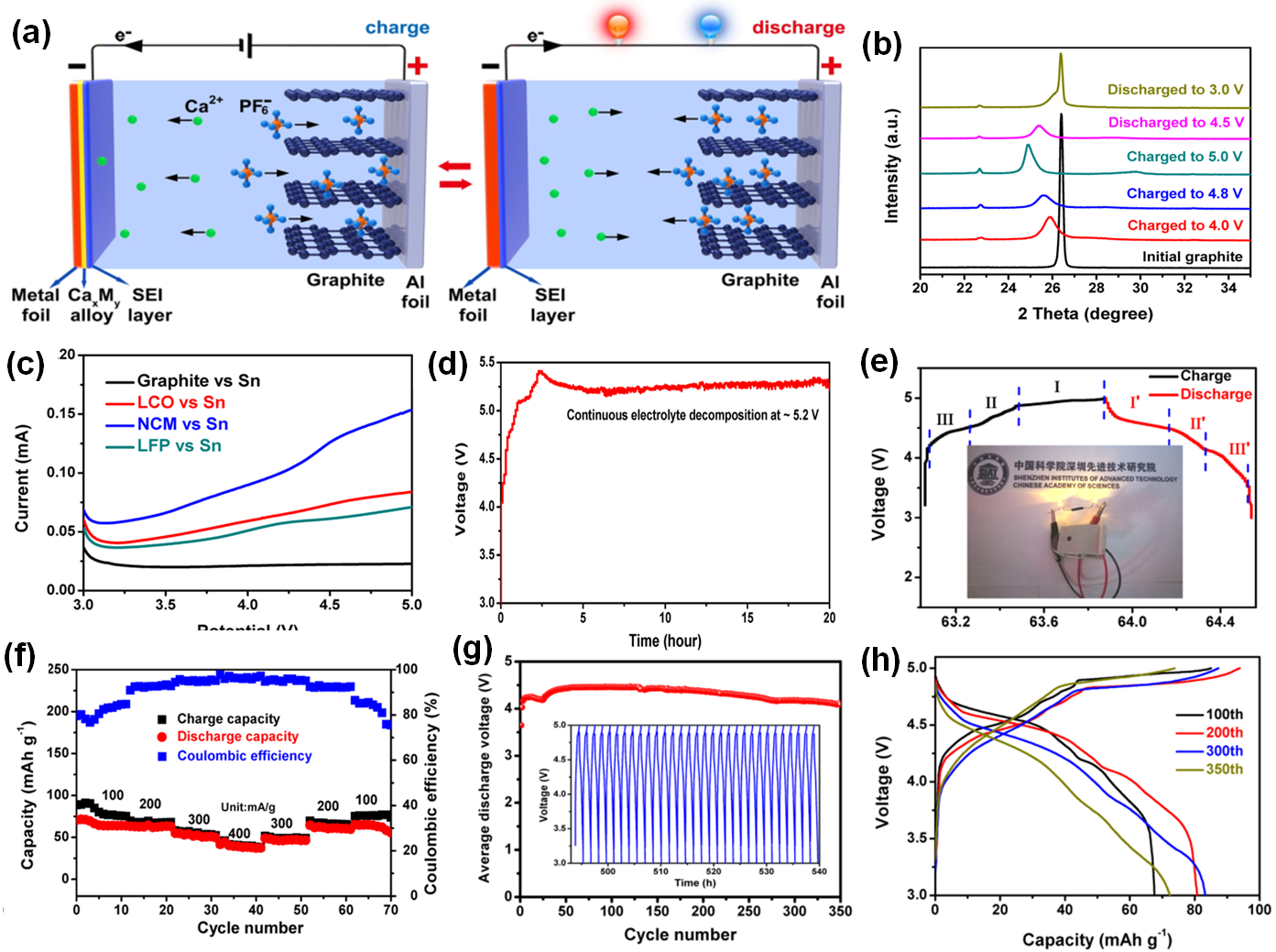 圖2.(a)新型鈣離子電池的結構及工作原理;(b)在不同電壓下石墨正極的XRD圖譜;(c)四元耐壓電解液體系在不同正極對錫負極電池中的線性掃描伏安曲線;(d)四元電解液體系在100 mA/g 的充電電流密度下的耐高電壓測試曲線;鈣離子電池的(e)充放電曲線(一塊鈣離子紐扣電池可點亮兩個串聯的黃色LED燈)、(f)倍率性能、(g)放電中壓隨循環圈數的變化(插圖為320-350圈的充放電曲線)和(h)在不同循環次數下的充放電曲線。