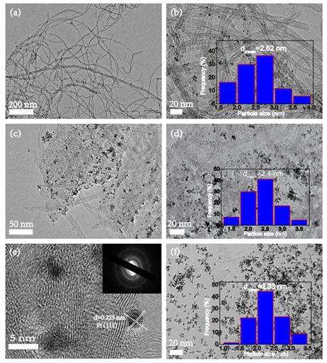 圖1 (a-b) Pt/CNTs的TEM圖; (c-e) Pt/GNTs的TEM圖; (f) Pt/rGO的TEM圖