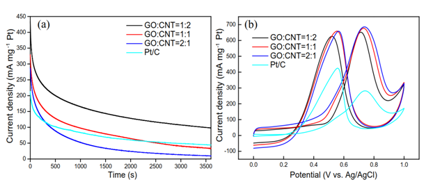 研究人員將氧化石墨烯(GO)與碳納米管(CNTs)自組裝后形成一種三維結(jié)構(gòu),然后負(fù)載鉑,并通過(guò)氫等離子放電可以得到具有較大比表面積的鉑基三維石墨烯-碳納米管催化劑(Pt/GNTs),具有優(yōu)異的甲醇氧化催化性能。該技術(shù)路線綜合GO與CNTs各自的優(yōu)點(diǎn)通過(guò)自組裝的方式形成三維復(fù)合結(jié)構(gòu),增大了比表面積,更有利于鉑納米顆粒的分布(圖1)。隨后,科研人員在實(shí)驗(yàn)中制備了一系列不同GO與CNTs質(zhì)量比(GO: CNTs=0:1, 1:6, 1:4, 1:2, 1:1, 2:1, 4:1, 6:1和1:0)的催化劑,結(jié)果發(fā)現(xiàn)GO: CNTs=1:2時(shí)對(duì)甲醇的催化性能最好,電流密度高達(dá)691.1 mA/mg,這個(gè)數(shù)值較商用鉑碳催化劑性能提升了87.7%,并優(yōu)于大部分已報(bào)道的其他催化劑,經(jīng)過(guò)3600s的CA測(cè)試之后仍然保持較高的電流密度(圖2)。該結(jié)果與載體的結(jié)構(gòu)性能有很大關(guān)系,詳細(xì)分析見(jiàn)原文。該研究對(duì)制備高效的甲醇氧化反應(yīng)催化劑有重要意義,對(duì)三維石墨烯載體的制備也提供了一種嶄新的思路。